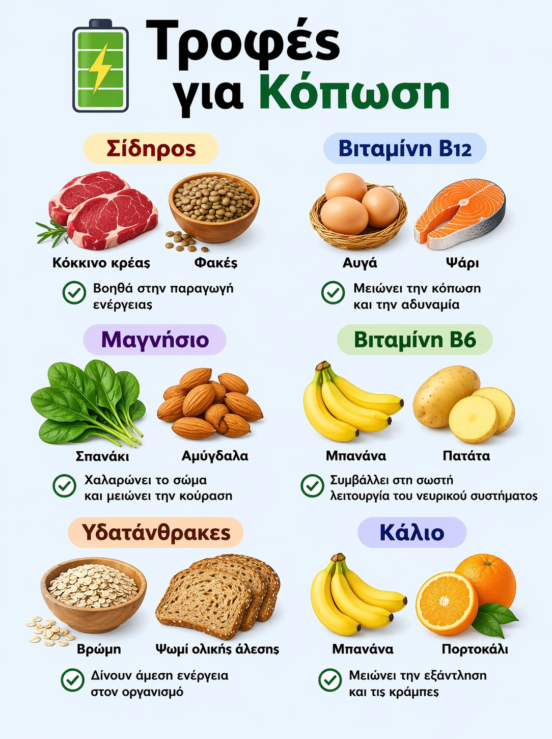 Μια ισορροπημένη διατροφή πλούσια σε αυτά τα συστατικά μπορεί να αλλάξει ριζικά τα επίπεδα της ενέργειάς σας. Ωστόσο, αν η κόπωση επιμένει παρά τη σωστή διατροφή και την ανάπαυση, είναι σημαντικό να συμβουλευτείτε τον γιατρό σας για έναν πλήρη αιματολογικό έλεγχο, καθώς μπορεί να υποκρύπτεται κάποια άλλη αιτία, όπως αναιμία ή θυρεοειδοπάθεια.