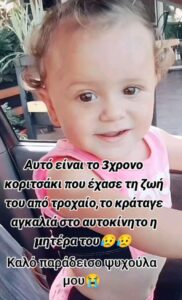 Αυτό είναι το 3χρονο κοριτσάκι που έχασε τη ζωή του στο τροχαίο, ενώ το κρατούσε αγκαλιά η μητέρα του