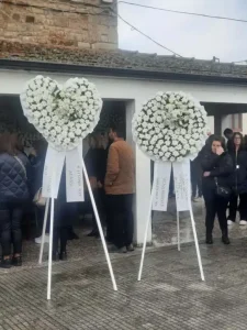 Το στεφάνι από τη «διοίκηση της Βιολάντα», στην κηδεία της της Αγάπης Μπουνόβα, που τελέστηκε στο Μεγαλοχώρι Τρικάλων. Δίπλα ακριβώς, το στεφάνι από τη μικρή εγγονή της άτυχης γυναίκας