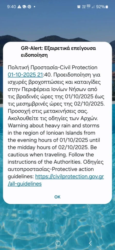 Σε πρώτη ειδοποίηση από τη Γενική Γραμματεία Πολιτικής Προστασίας αναφέρεται ότι η κακοκαιρία στο Ιόνιο θα χτυπήσει από τις βραδινές ώρες της 01/10/2025 έως τις μεσημβρινές ώρες της 02/10/2025. «Προσοχή στις μετακινήσεις σας. Οι πολίτες καλούνται να ακολουθούν τις οδηγίες των Αρχών» σημειώνεται στο μήνυμα του 112.