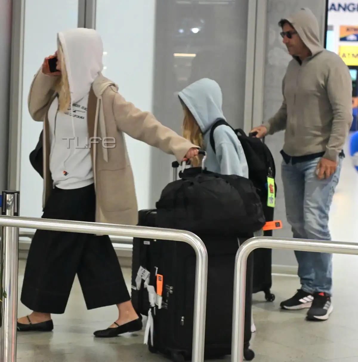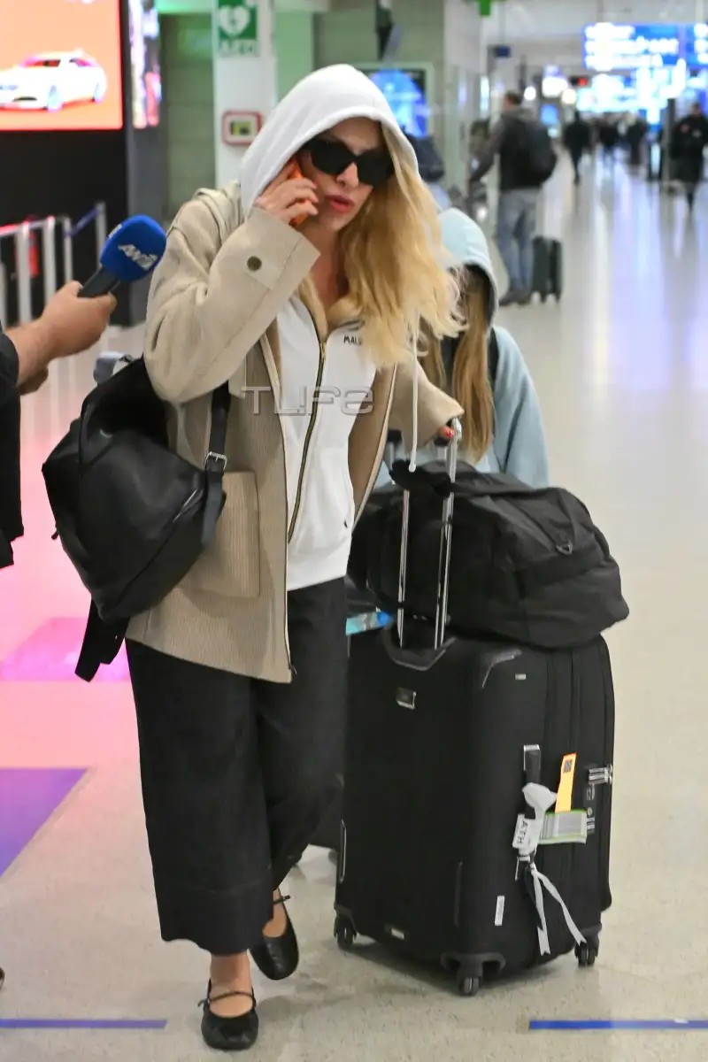 Στις φωτογραφίες που εξασφάλισε το TLIFE, η Ελένη Μενεγάκη εμφανίζεται χαλαρή και casual, φορώντας ένα άνετο look με hoodie, σακάκι και γυαλιά ηλίου, ενώ τη βλέπουμε να μιλά στο κινητό της τηλέφωνο. Δίπλα της, ο Μάκης Παντζόπουλος κινείται διακριτικά, κρατώντας τις αποσκευές τους, ενώ μαζί τους βρίσκεται και η μικρή τους κόρη, Μαρίνα.