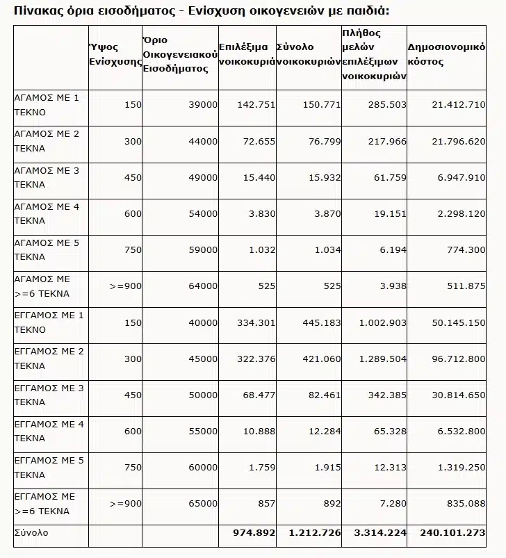 Σύμφωνα με τις ανακοινώσεις, το ύψος της ενίσχυσης αυξάνεται κλιμακωτά ανάλογα με τον αριθμό των τέκνων, ενώ αντίστοιχα προσαρμόζονται και τα εισοδηματικά κριτήρια. Για τα έγγαμα ζευγάρια, το ανώτατο όριο εισοδήματος ανεβαίνει όσο αυξάνεται ο αριθμός των παιδιών, ενώ για τις μη έγγαμες οικογένειες προβλέπονται τα ίδια ποσά επιδότησης, με εισοδηματικό πλαφόν μειωμένο κατά 1.000 ευρώ.