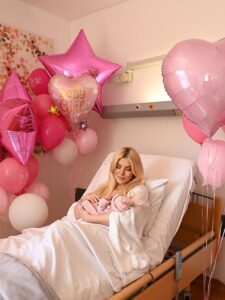 Στις εικόνες που δημοσίευσε, το δωμάτιο στο μαιευτήριο είναι γεμάτο ροζ μπαλόνια και διακοσμητικά, δημιουργώντας ένα σκηνικό γιορτής για τον ερχομό του μωρού. Δίπλα της βρίσκεται και ο σύντροφός της, Παναγιώτης Κουτσουμπής, με τον οποίο μοιράζεται αυτές τις πρώτες, μοναδικές στιγμές ως μαμά και μπαμπάς πλέον.