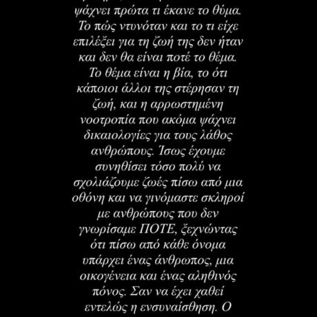 Στο κείμενό της, η ίδια αναφέρεται με σκληρή γλώσσα στην τάση που παρατηρείται στα social media να μετατοπίζεται η συζήτηση από την πράξη της βίας προς το ίδιο το θύμα, τονίζοντας ότι η ουσία δεν βρίσκεται ποτέ στις επιλογές ή στη ζωή του ανθρώπου που χάθηκε, αλλά στην πράξη που του στέρησε τη ζωή.