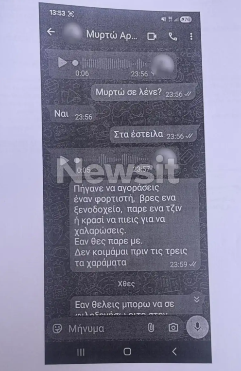Τα τελευταία μηνύματα που αντάλλαξε η Μυρτώ μέσω διαδικτυακής εφαρμογής με έναν 66χρονο άνδρα, ενώ βρισκόταν στο ενοικιαζόμενο δωμάτιο στην Κεφαλονιά, όπου έχασε τις αισθήσεις της και εγκαταλείφθηκε λίγη ώρα αργότερα από τους τρεις κατηγορούμενους στην κεντρική πλατεία του Αργοστολίου, φέρνει στο φως της δημοσιότητας το newsit.gr.