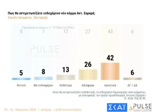 H ΝΔ φτάνει περίπου στο 31% και έχει διαφορά 16,5 μονάδες από το δεύτερο κόμμα σύμφωνα με την νέα δημοσκόπηση της Pulse για λογαριασμό του ΣΚΑΪ.