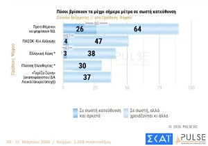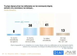 Όσον αφορά τα μέτρα της κυβέρνησης για την καταπολέμηση της ακρίβειας εν μέσω της σύγκρουσης στη Μέση Ανατολή, το 46% τα βλέπει με θετικό μάτι.