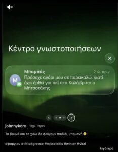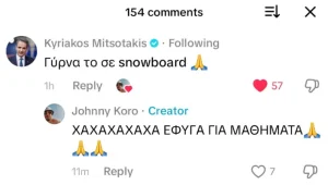 Συγκεκριμένα όταν ένας σκιέρ ανέβασε στο προφίλ του στο TikTok δύο φωτογραφίες του από το χιονοδρομικό κέντρο και ένα screenshot από μήνυμα του πατέρα του που τον παρακαλούσε να προσέχει λόγω της παρουσίας Μητσοτάκη στα Καλάβρυτα, δεν περίμενε ότι θα δει απάντηση από τον ίδιο τον Πρωθυπουργό.