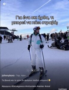 «Για ένα σκι ήρθα, τι μπορεί να πάει στραβά;», αναρωτήθηκε αρχικά ο σκιέρ με όνομα χρήστη στο TikTok «johnnykoro» και στη συνέχεια μας παρουσίασε την προειδοποίηση του πατέρα: «Πρόσεχε αγόρι μου σε παρακαλώ γιατί έχει έρθει για σκι στα Καλάβρυτα ο Μητσοτάκης».