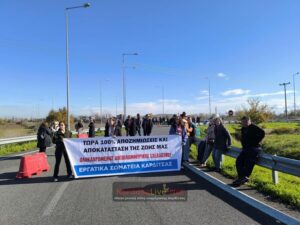Κλούβες των ΜΑΤ είχαν κλείσει τις εισόδους και εξόδους του ανισόπεδου κόμβου του αυτοκινητόδρομου Ε-65, προκειμένου να αποτρέψουν την πρόσβαση στους διαδηλωτές.