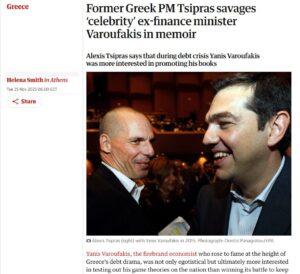 Κάνει ιδιαίτερη αναφορά σε όσα γράφει στην Ιθάκη για τον Γιάνη Βαρουφάκη, και στη φράση ότι ήταν «περισσότερο διάσημος παρά οικονομολόγος».