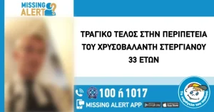 Με τον πιο οδυνηρό τρόπο ολοκληρώθηκε η υπόθεση της εξαφάνισης του Χρυσοβαλάντη Στεργιανού, ηλικίας 33 ετών, σκορπίζοντας βαρύ πένθος στην οικογένεια και στους ανθρώπους που τον αναζητούσαν επί εβδομάδες. Ο άνδρας εντοπίστηκε, σύμφωνα με τις διαθέσιμες πληροφορίες, στην περιοχή του Ζεφυρίου, λίγες ημέρες μετά τη δήλωση της εξαφάνισής του, και μεταφέρθηκε εσπευσμένα στα επείγοντα νοσοκομείου, όπου και κατέληξε.