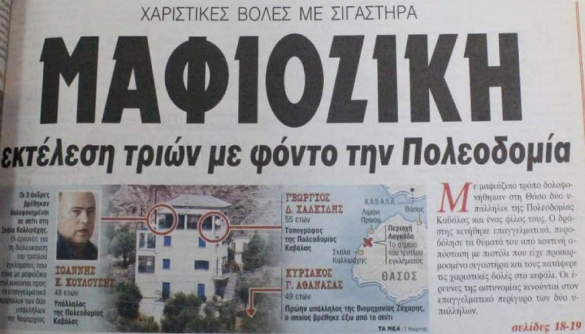 «Μαφιόζικη εκτέλεση με φόντο την πολεοδομία», έγραφαν τα τότε πρωτοσέλιδα των εφημερίδων, μια μέρα μετά την αποκάλυψη του μακελειού σε μια βίλα στην Καλλιράχη της Θάσου.