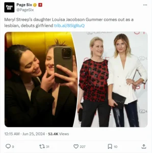 Η Λουίσα Γιάκομπσον Γκάμερ, κόρη της Μέριλ Στριπ, ανακοίνωσε δημοσίως ότι είναι ομοφυλόφιλη και δημοσίευσε μια φωτογραφία με τη σύντροφό της στο Instagram το περασμένο Σαββατοκύριακο.
