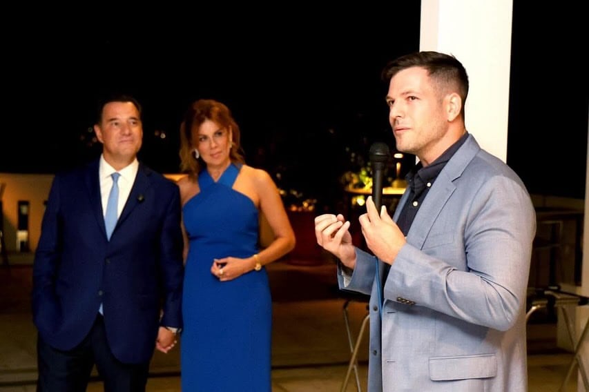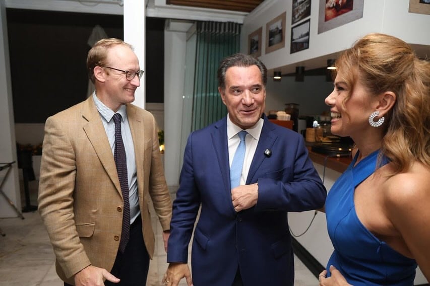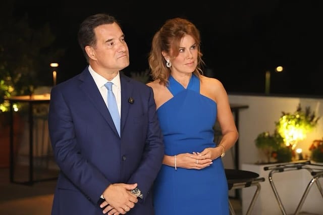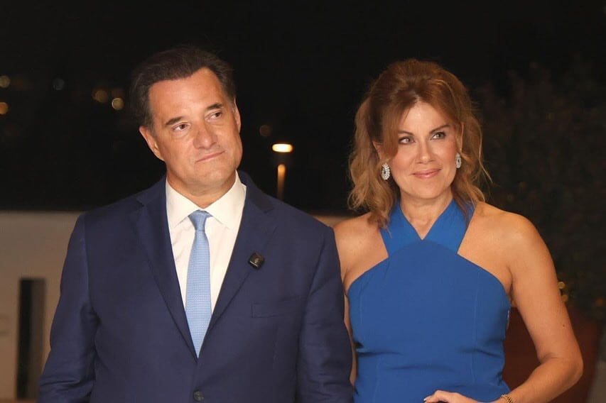 Με εντυπωσιακή μπλε δημιουργία η Ευγενία Μανωλίδου, δίπλα στο σύζυγό της και υπουργό υγείας, ‘Αδωνι Γεωργιάδη