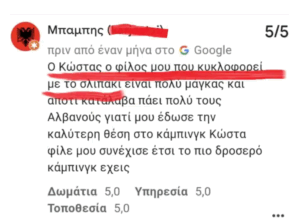 Ανάμεσα στα θετικά σχόλια που αναρτήθηκαν μέσα στο ίδιο χρονικό διάστημα, ξεχωρίζει και μια αναφορά σε «φιλοαλβανική στάση» του ιδιοκτήτη, με υπονοούμενα για εύνοια σε αλλοδαπούς πελάτες. Το ύφος του συγκεκριμένου σχολίου είναι ειρωνικό και προκαλεί αίσθηση, αφού συνδέει την επαγγελματική συμπεριφορά του 68χρονου με εθνικές προκαταλήψεις – κάτι που δεν έχει καμία θέση σε μια απλή αξιολόγηση καταλύματος.
