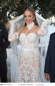 Η τραγουδίστρια εντυπωσίασε μέσα στο λαμπερό και εντυπωσιακό νυφικό της, το οποίο ήταν φτιαγμένο όλο με δαντέλα με διαφάνεια, αναδεικνύοντας το καλλίγραμμο κορμί της, Ο τραγουδιστής από την άλλη ήταν κομψός και λιτός ντυμένος με ένα απλό μαύρο κουστούμι και λευκό πουκάμισο με παπιγιόν, ταιριάζοντας πλήρως με την νύφη.