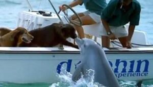 Το δελφίνι σε αυτό το βίντεο, βλέπει ένα ζευγάρι σκύλων πάνω σε ένα σκάφος. Δεν είναι σαφές αν το δελφίνι ήταν συγκινημένο ή ήταν απλά περίεργο! Το δελφίνι αναδύεται από το νερό για να δώσει ένα φιλί στη μύτη του ενός σκύλου. Και ο σκύλος όμως ανταπέδωσε και φίλησε ο ένας τον άλλον!