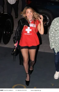 Η Μπέττυ Μαγγίρα έκανε μία πολύ κομψή και εντυπωσιακή εμφάνιση, όπως πάντα, με ένα μαύρο φόρεμα, στενό, με άνοιγμα στο στήθος, μαύρα ψηλοτάκουνα πέδιλα, ολοκληρώνοντας το look της με ένα μαύρο σακάκι και μία μικρή τσάντα στα χέρια της. Ο καλός της, από την άλλη πλευρά, επέλεξε γκρι τζιν, καστόρινα παπούτσια και ένα μαύρο δερμάτινο μπουφάν, φορώντας από μέσα ένα γκρι t-shirt.