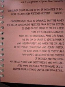«Ο καταναλωτής πρέπει επίσης να γνωρίζει ότι τα χρήματα που η ελληνική κυβέρνηση λαμβάνει από το φορολογικό σύστημα δίνεται στις τράπεζες για να πληρώσουν ένα χρέος που οι ίδιες δημιούργησαν μαζί με το Διεθνές Νομισματικό Ταμείο. Πληρώνουμε φόρους για να ζούμε στην φτώχεια και τη ανεργία, παρακολουθώντας την κατάρρευση της δημόσιας εκπαίδευσης και του συστήματος υγείας.