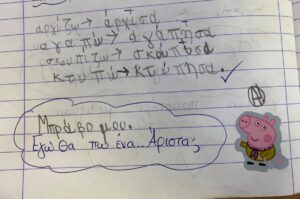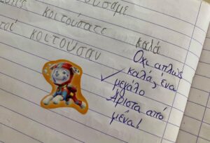 Αυτό που μας ενθουσίασε είναι τα σχόλια που χρησιμοποίησε, όταν διόρθωνε γραπτά ορθογραφίας μαθητών, στα πλαίσια της επιβράβευσης ως κίνητρο μάθησης. Τι το ξεχωριστό έκανε; Ζήτησε από τους μαθητές του μα προσθέσουν μία λέξη ενθάρρυνσης για την προσπάθειά τους, στο τέλος της άσκησης. Τα παιδιά όντως ανταποκρίθηκαν και όλα έγραψαν κάτι θετικό. Στη συνέχεια, ανέλαβε ο ίδιος και έγραψε το δικό του ξεχωριστό μήνυμα επιβράβευσης, στο σχόλιο κάθε μαθητή.