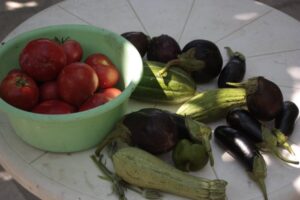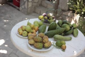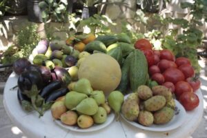 Έτσι, πέρα από τα διάφορα , λουλουδικά που διαθέτει στην αυλή της, και τα διάφορα δένδρα στον κήπο της, τα οποία της παρέχουν ποικιλία φρούτων όλο το χρόνο, όπως πορτοκάλια, μανταρίνια, λεμόνια, βερίκοκα, ρόδια, σύκα, μούρα, ροδάκινα, μπουρνέλες καπλόσυκα, μούσμουλα, λοτούς απίδια και σταφύλια, παράλληλα φυτεύει εποχιακά κηπευτικά, μποστανικά και χορταρικά!