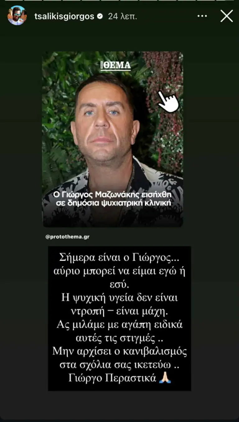 «Σήμερα είναι ο Γιώργος, αύριο μπορεί να είμαι εγώ ή εσύ. Η ψυχική υγεία δεν είναι ντροπή – είναι μάχη. Ας μιλάμε με αγάπη ειδικά αυτές τις στιγμές. Μην αρχίσει ο κανιβαλισμός στα σχόλια. Σας ικετεύω. Γιώργο περαστικά» γράφει ο Γιώργος Τσαλίκης.