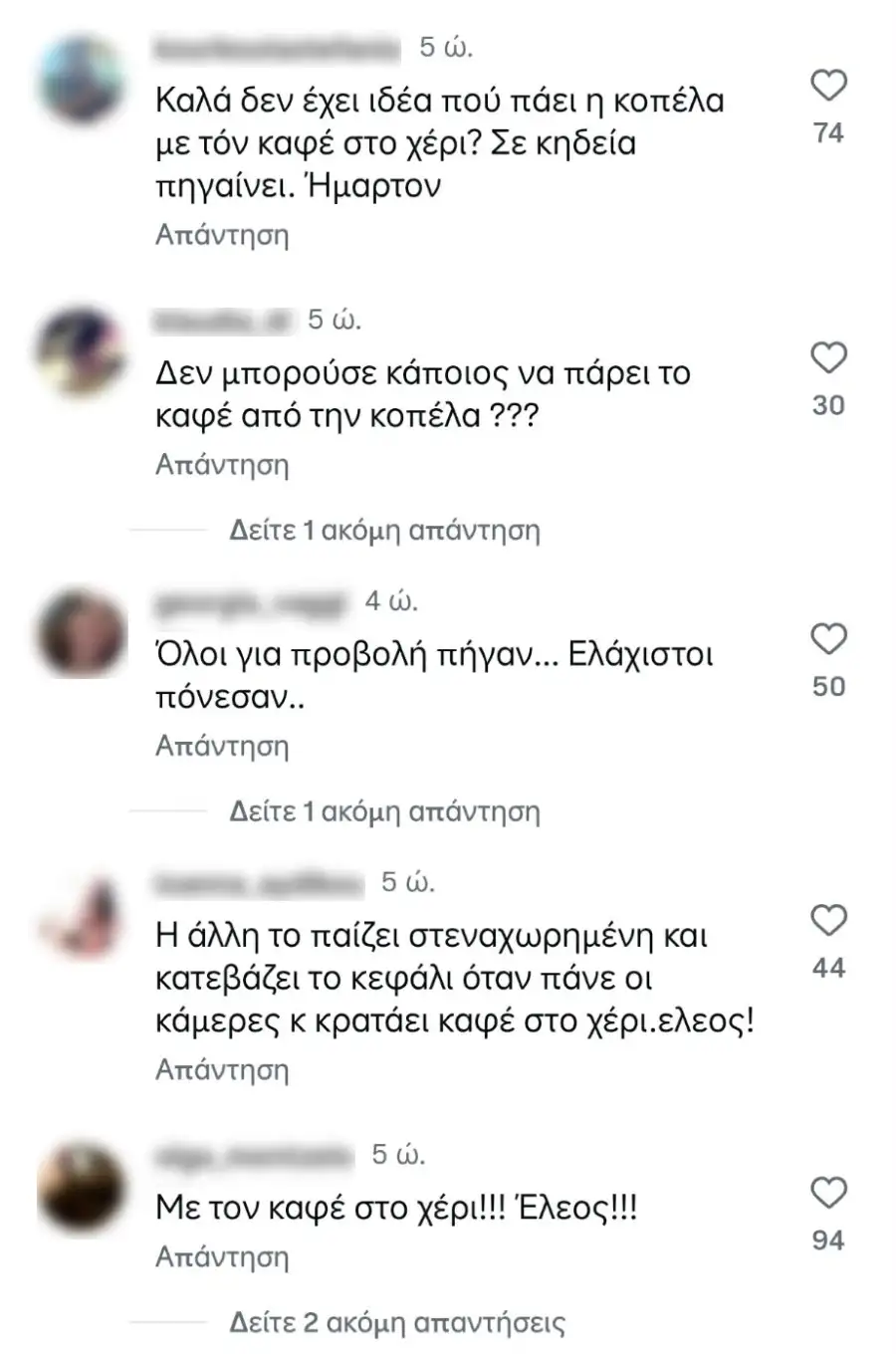 «Ούτε τα βασικά η Μαστορού… Η κυρία με τον καφέ και το τζινάκι περαστική είναι; Με τον καφέ στην κηδεία; Δεν άντεξε να τον πιει μετά; Η Αγρινιώτισσα με τον καφέ στο χέρι…» ήταν μερικά από τα αρνητικά σχόλια που γράφτηκαν κάτω από τις αναρτήσεις στα social media του TLIFE.